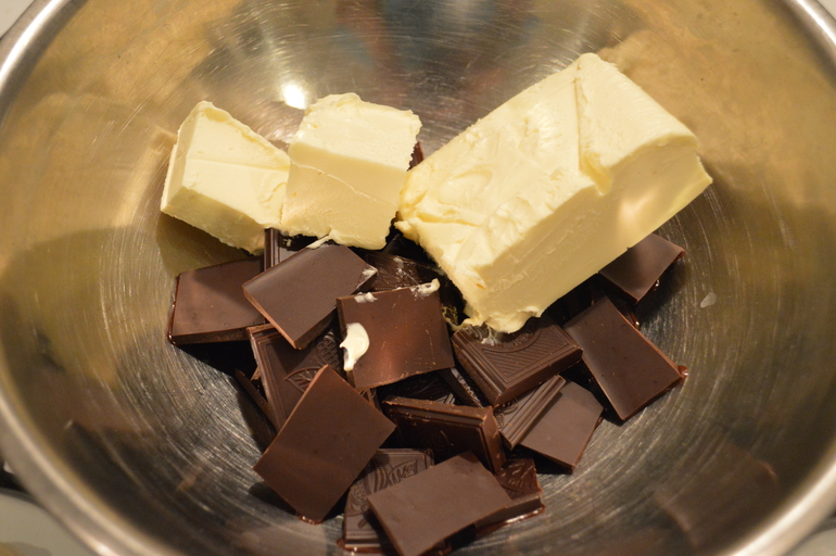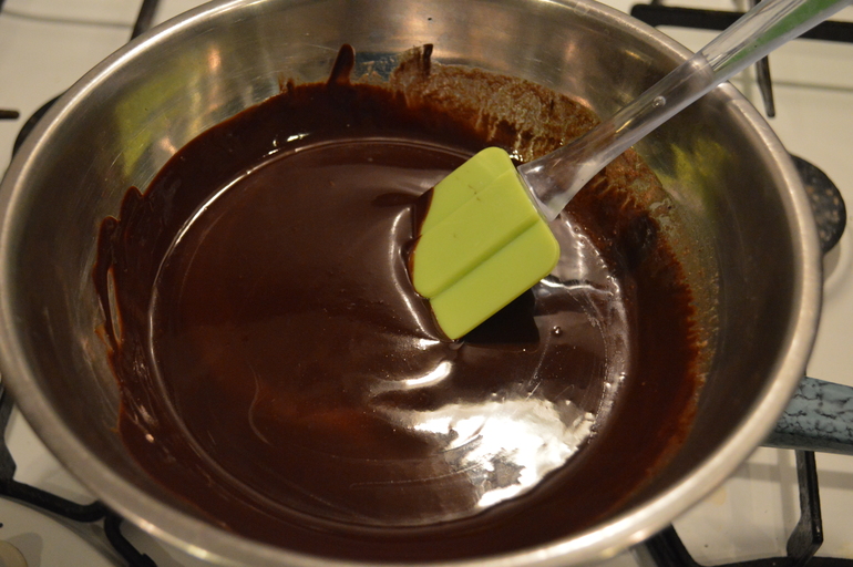 Миска с шоколадом и маслом не должна касаться воды. Вода не должна кипеть. Ждем, пока масло и шоколад растопятся примерно на 70%, потом паровую баню можно снять с огня и подождать, пока всё полностью растопится. После аккуратно перемешать резиновой лопаткой. Оставляем заготовку остыть до температуры примерно 36 градусов.