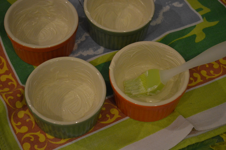 6. Взбиваем венчиком сливочное масло для смазывания, смазываем формы кисточкой до краев. Формочки нужно брать керамические.