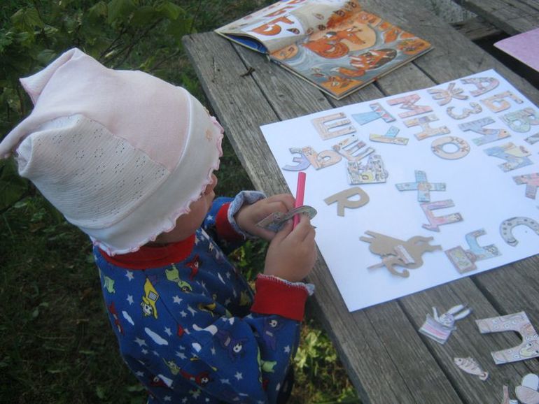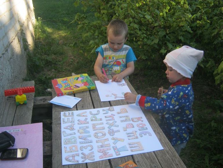 Когда фотографировала, то спонтанно получилась прямо-таки школа летняя) Антон (5 лет) усердно пишет буквы своего имени, Полина (3 года) активно играет персонажами из азбуки.