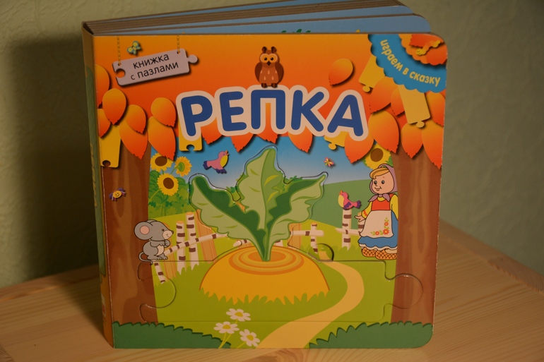 "Репка". Также покупала оффлайн в магазине "Школа Семи Гномов", цена около 300 руб. Замечательная книга! Пазлы Соня вытаскивает пока еще с моей помощью, но прекрасно находит и кладет героев обратно на свое место. Качество и картона, и иллюстраций идеальны. Радует, что дед, бабушка, мышка и т.д. по высоте адекватны друг другу