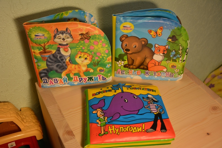 Затем опять же из "Ашана" папа привез нам вот такие книжки (цену, увы, даже примерно не знаю). Читала в ванной с трех месяцев, при кормлении читаем-играем по сию пору.