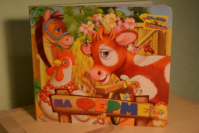 "На ферме" (в "Лабиринте" цена 406 руб.). Скажу честно - мне не понравилась абсолютно. Слишком пестра, не очень понятен смысл задвижек и картинок под ними. Но Соня в восторге, до сих пор любит эту книгу.