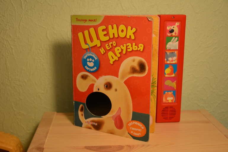 Первая наша музыкальная книга с тактильными вставками, превосходной озвучкой и великолепными картинками - "Щенок". Покупала в "Читай-городе", стоимость около 500 руб.