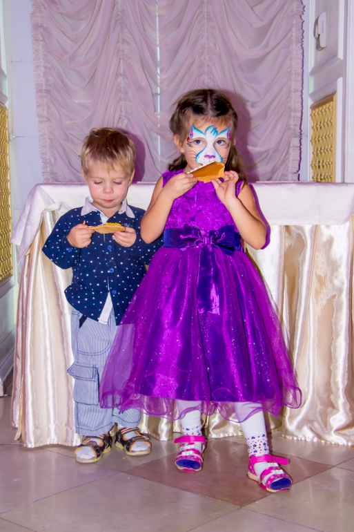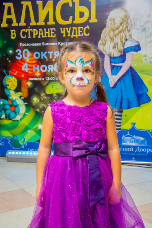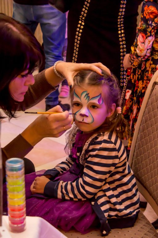 Перед программой была организована работа аниматора и аквагрим. Дети играть с аниматором отказались, а Лизонька тут же попросила сделать ей кошку: в аквагриме она всегда выбирает кошку. Кстати, это наиболее качественный и аккуратный аквагрим (и дорогой), который нам когда-либо делали. Дениска не захотел, чтобы ему что-то рисовали (вот и хорошо, а то я бы разорилась:)).