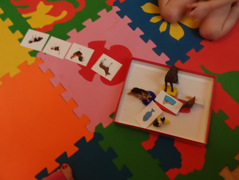 Послушали звуки животных. Кошку и собаку Лизонька признала. Петуха обозвала ослом, а звуки осла вообще отказалась комментировать.