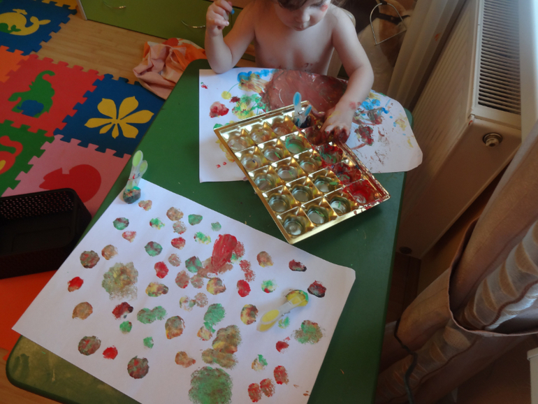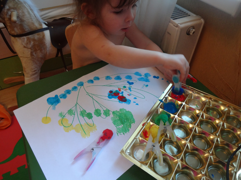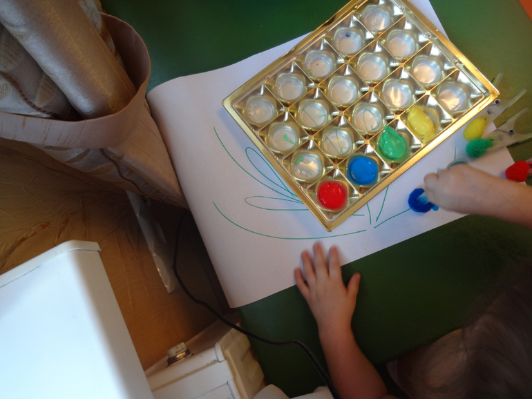На заключительную часть все же мне удалось уложить Дениску спать. Так что рисовали мы вдвоем. Рисовали цветы помпонами.