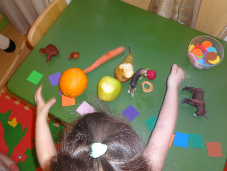Кормим героев. Ну, кость и зерно Лиза выдала сразу, а вот с рыбой запнулась. Как-то мы все время проговариваем, что кот любит мышей, молоко, а про рыбу забываем.