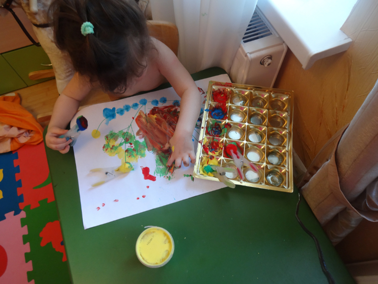 А дальше Лизонька опять перешла к технике маляра. Она смешала все краски воедино и начала возюкать по листу попеременно то помпонами, то пальцами.