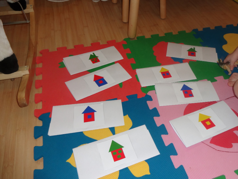 Отгадываем в каких домиках спрятались наши герои. Использовала 8 домиков. Проговаривала 2 признака: цвет крыши и цвет окон. Первые 3 домика прошли просто и безошибочно. Последний домик был с подковыркой: синяя крыша и синие окна. Поближе к Лизе я подложила домик с одним окном, она его и схватила. Тогда я уточнила: "синяя крыша и 2 синих окна", взяла правильный домик.