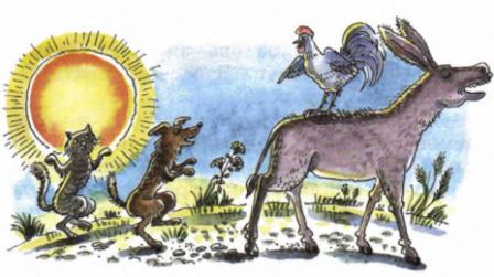 Получив заранее материалы ТЗ, я прочитала, что ребенок изначально должен быть знаком со сказкой. "Бременские музыканты" мы с Лизонькой никогда не читали, пару раз слушали сказку на английском, но я почти уверена, что она из нее мало, что вынесла. Поэтому я скачала, распечатала на плотной бумаге и готовилась как-нибудь ее подсунуть Лизе.