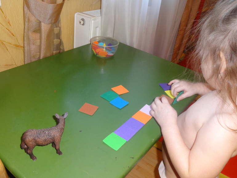 Дорога в Бремен. Пробовала играть на отрицание. "Будем строить из НЕ треугольных и НЕ квадратных кирпичей". Ну, вроде как дорога из круглых кирпичей - это необычно, и то, что мы никогда не строим. Спросила, так из каких кирпичей будем строить дорогу? Лиза указала на круглые, но строить не стала... А потом сказала, что из круглых строить не будет. Пыталась ее убедить, что это необычная дорога - сказочная. Отказалась. Сказала "НЕ из круглых и НЕ из треугольных". Сложила их, и стала строить банальную дорогу из квадратных кирпичей.