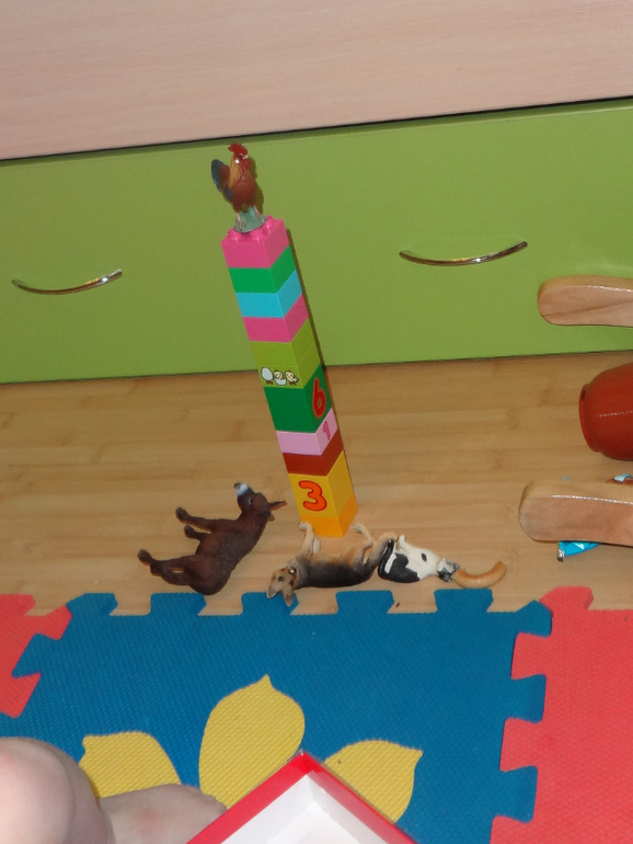 Строили лесенку петуху. Сложила сама все правильно за исключением самой маленькой палочки, даже странно, что она ее туда засунула.