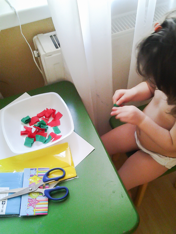 Сначала мы порезали бумагу на полоски. В основном резала я, Лизонька, сделав пару попыток, отказалось. Пока я резала, Лизонька разделяла бумагу на составляющие части: