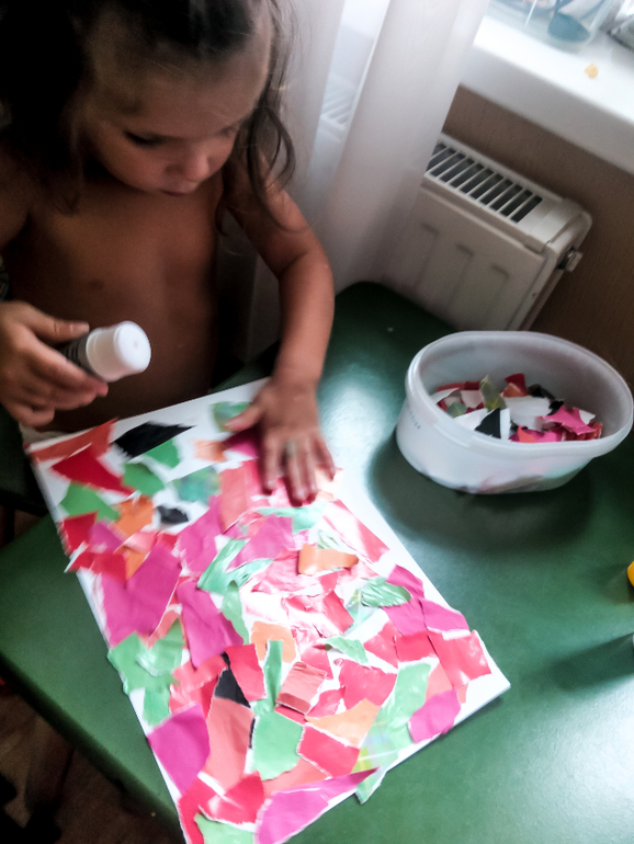 Сначала порвали цветную бумагу. Каково было мое удивление, когда я поняла, что Лизонька не умеет рвать бумагу. Она просто тянет в разные стороны, естественно, бумага мнется, а не рвется. Будем повторять подобное "занятие".