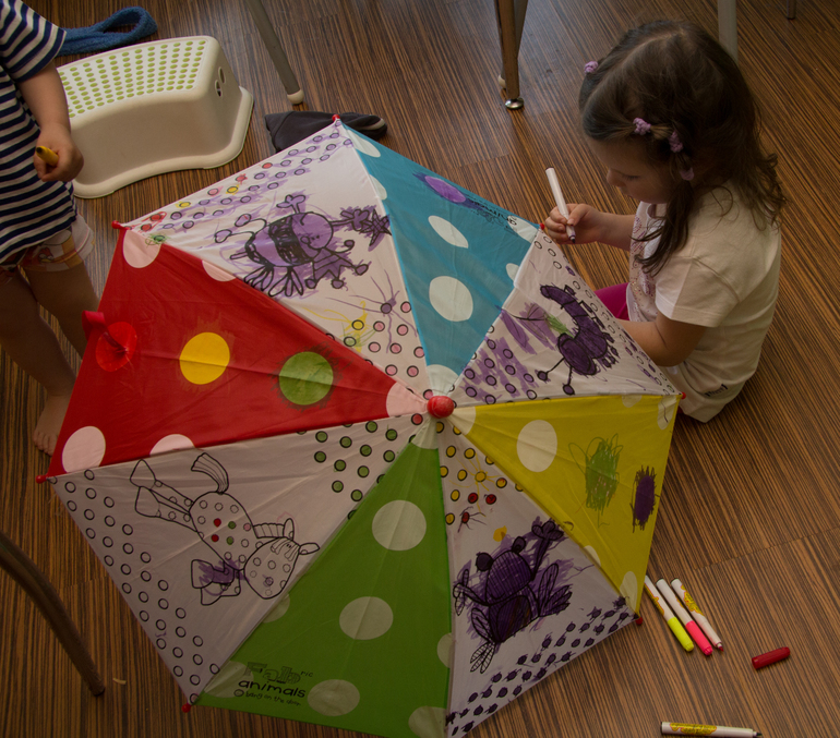 ИгрушкиКогда Лизоньке было 2 года, ей подарили вот такой зонтик для раскрашивания. Я его благополучно спрятала, т.к. в 2 года мы бы много что там нараскрашивали, но в 3 он попался Лизоньке на глаза, и я выдала его на растерзания.