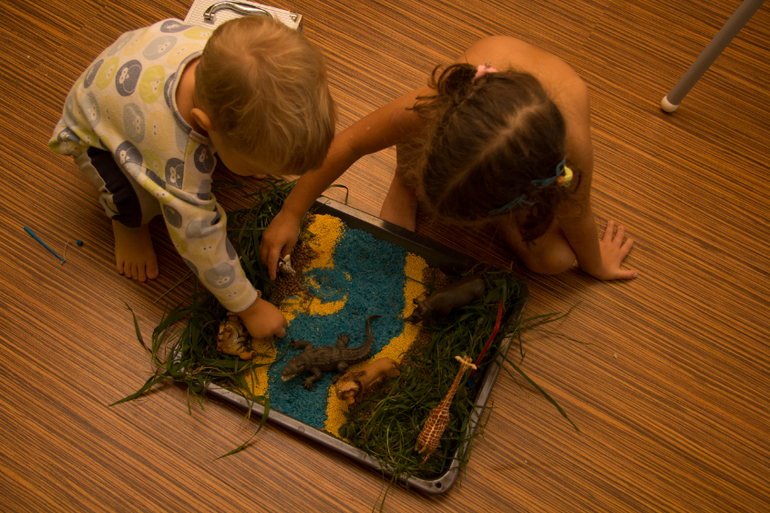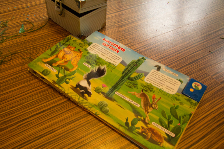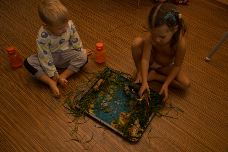 Я достала книгу от Азбукварика, и в параллель с игрой, я читала им про зверушек, заодно приносили в нашу саванну зверей, которых я изначально не поселила в коробке.