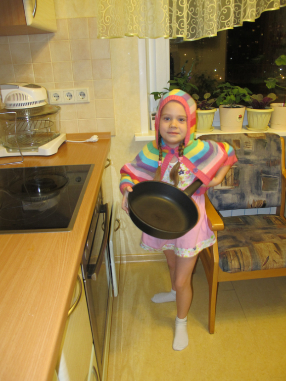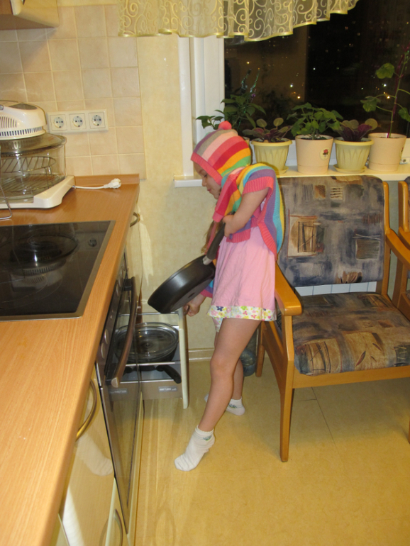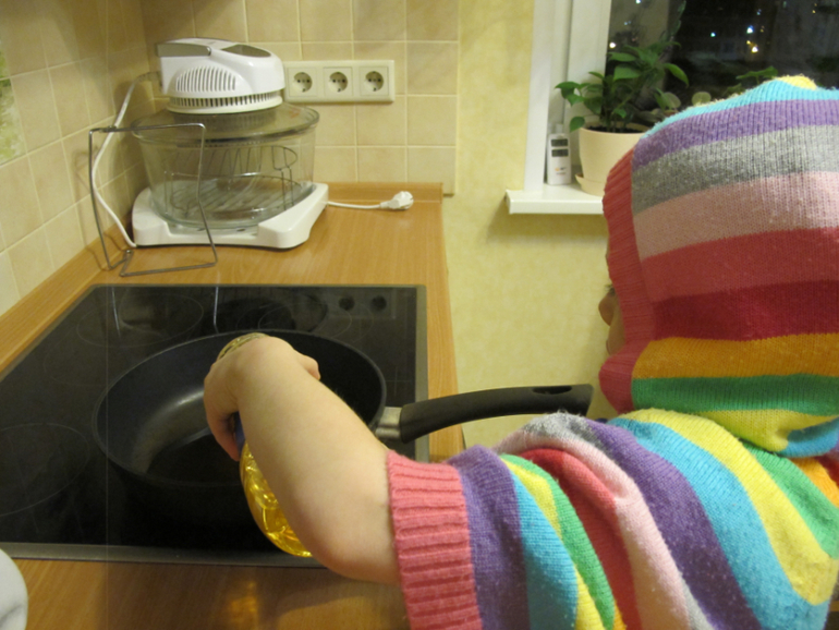 Замесили, пусть постоит. А мы будем пока готовить начинку. Доставай сковородку, Настя.