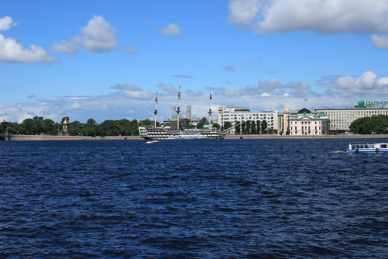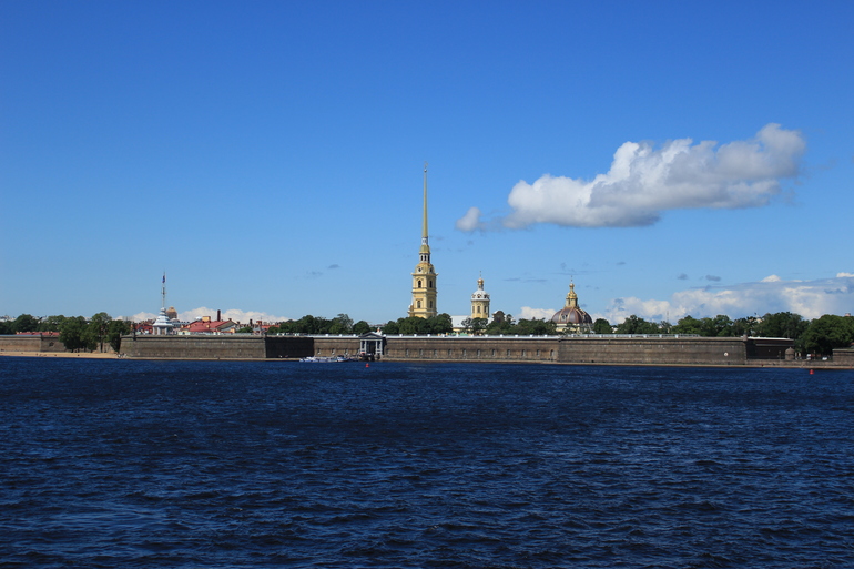 Пройдя через Летний сад, мы вышли на Дворцовую набережную и по ней дошли до Троицкого моста. Нева: