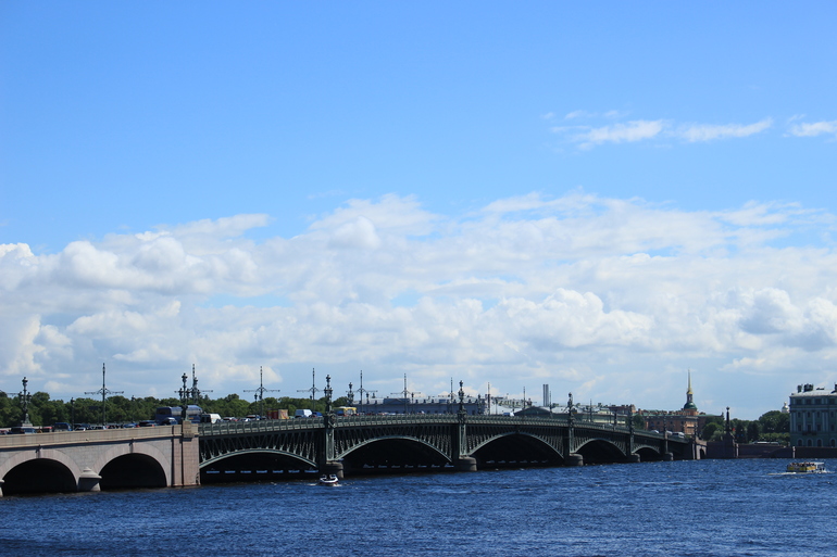 Однако понадобились не годы - десятилетия, чтоб на Неве появился первый постоянный переход. Это был построенный в 1850 году по проекту русского инженера С. В. Кербедза Благовещенский мост (впоследствии он назывался Николаевским, а в годы Советской власти - лейтенанта Шмидта). И лишь в 1897-1903 годах построили постоянный Троицкий мост.