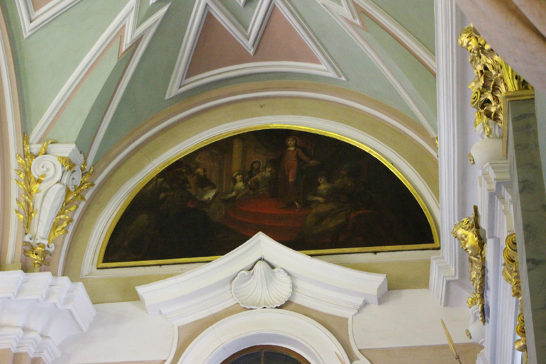 Далее путь ведет к Петровским воротам. Ворота были созданы по проекту архитектора Трезини в форме триумфальной арки. Они украшены двуглавым романовским орлом и деревянным барельефом «Низвержение Симона-волхва святым Петром». Это изображение символизирует победу Петра I над шведским королем Карлом XII. Царь Петр предстает в лавровом венке. Справа от него находится статуя Беллоны - богини войны (аллегория военных подвигов царя), а слева - статуя Минервы (аллегория заслуг царя как законодателя).