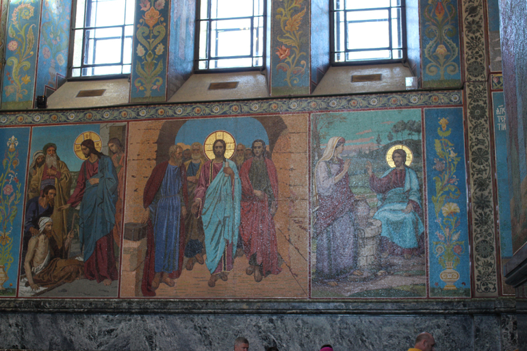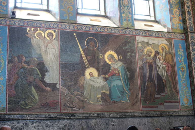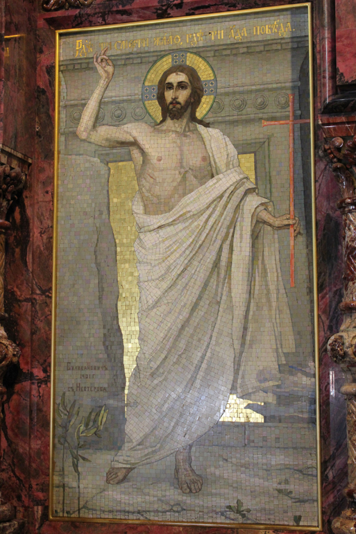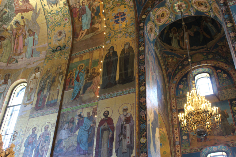 Даже до революции в соборе Воскресения Христова не проводились регулярные службы, если только они не были связаны с именем Александра II. Храм был в ведении Министерства внутренних дел, и потому был закрыт для свободного посещения, вход осуществлялся только по пропускам. Такой особый режим позволил создать особое же оформление, которое иначе, как изумительным и роскошным не назвать. Во-первых, оформители ушли от опыта многих расписных храмов, где живопись в условиях климата Петербурга начинала быстро разрушаться и портиться. Выбор был сделан в пользу мозаик, по общей площади которых храм стал уникальным как для России, так и Европы. Над ними трудились мастера Академии художеств, немецкие фирмы и частная мастерская Фроловых, получившая самый большой заказ. Любопытно, что мозаики использовались не только для внутреннего, но для внешнего декорирования храма (еще одно новшество в отечественном ритуальном зодчестве). Над эскизами работали В.М. Васнецов, М.В. Нестеров, А.П. Рябушкин, В.В. Беляев, Н.Н. Харламов и другие.