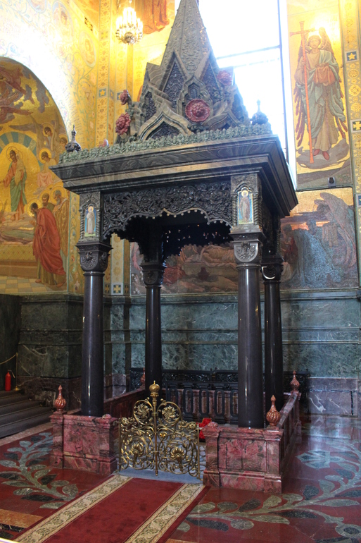 Она занимает в нем особое место, поскольку огораживает место бывшей Екатерининской набережной, где была взорвана карета Александра II. Каменный навес и фронтон со стилизованными вазами поддерживается четырьмя колоннами, завершающимися капителями. Богато оформленная драгоценными камнями Сень выполнена в виде восьмигранной пирамиды и креста, на отделку которого ушло более 110 топазовых камней. Пол, прикрытый Сенью, это реальный фрагмент булыжной мостовой и часть решетки, ставшие свидетелями рокового покушения.