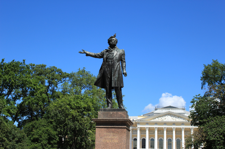 С обратной стороны дворца - Михайловский сад, а перед ним - Михайловский сквер с памятником Пушкину с голубем на голове:
