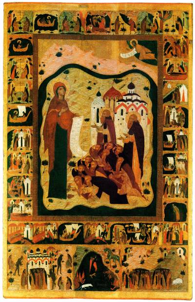 Икона Богоматери Боголюбской с житием Зосимы и Савватия Боголюбских 1545 г. Успенский собор Московского Кремля.