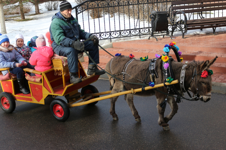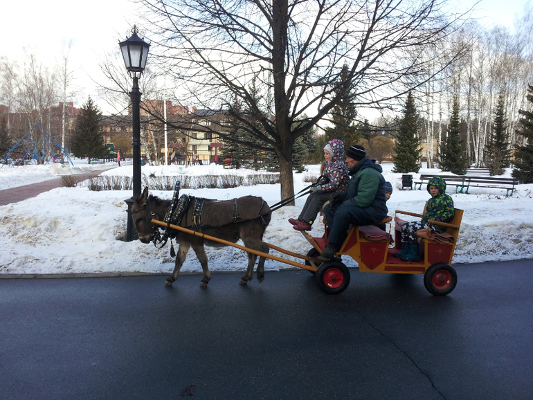 Какой же ослик то выносливый!!!!!!!!!! такой мелкий и столько народу и еще и повозку везет...Костюмы классные вам выдали