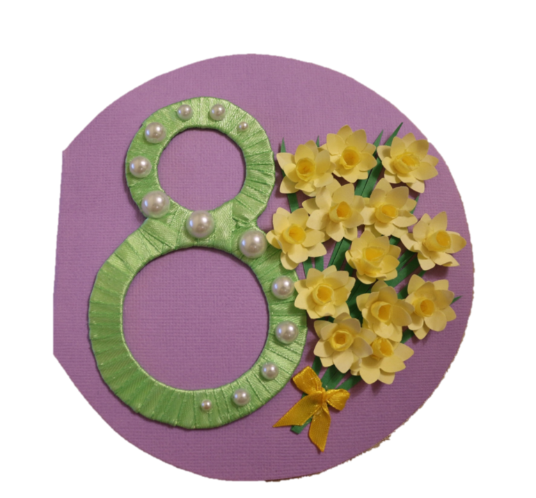 Всю открытку долго почему-то получилось. Замучались восьмерку лентой оборачивать. Настя с папой начали, потом я с папой делала. Одному неудобно - моток с лентой разваливается и перекручивается. Надо, чтоб один непосредственно обматывал, а второй продевал моток с лентой в кольца.