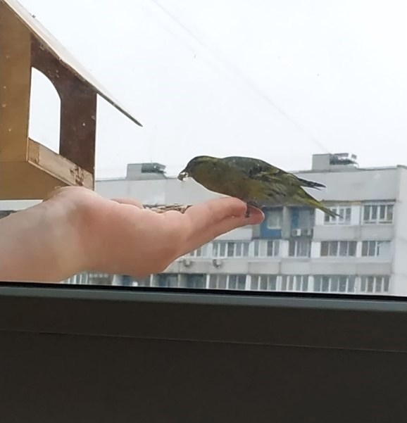 А сегодня утром встали - кормушка пустая, птички голодные. В кормушку насыпали, и с руки пытались - пошло)) Но мне кажется, это один и тот же чиж садится.