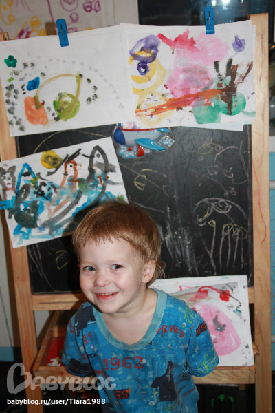 Рисовали кто как ходит..следы..сугробы..снеговик- две верхние картины рисовал сам!Наша выставка всегда висит до ночи..ночью, когда он засыпает, я все убираю!