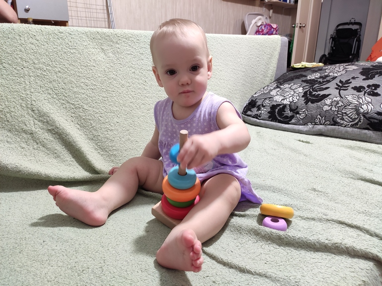Катюня начала ходить ровно в 11 месяцев) Болтает много!) Папа, мама, упал, кря-кря, ква-ква, пытается повторять почти все слова за нами!) начала собирать сортер с подачи Димки.
