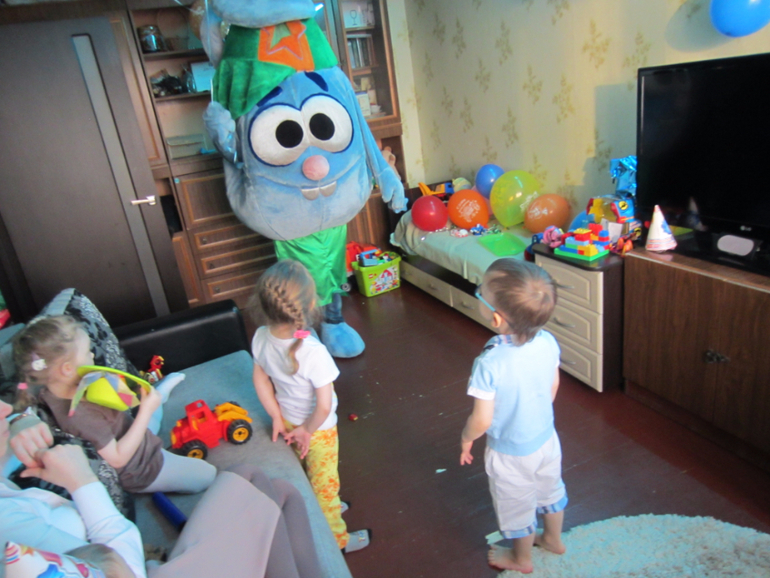 Сделали скромный шведский стол для родителей и спец. стол для детей. И так как переехать мы не успели до ДР, то обошлись маленьким, но очень душевным коллективом гостей. На пробу позвали 2 аниматоров. Надо отдать им должное, детям понравилось, вот только Димка восторга не испытал)) Сам виновник торжества, Симку, которая была первой, не оценил вообще, так как попросту испугался. С Крошем дело пошло веселее, Димка даже поучаствовал в развлекалках немного). В общем и целом все остались довольны, но места, конечно, было маловато.