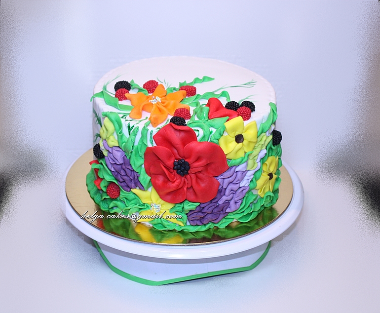Вот этот я делала сегодня по просьбе мужа на работу, в благодарность каким-то там женщинам в годах, в подробности не вдавалась. Часиков так в 18 клюнул мне петух сами знаете куда, когда я вспомнила, что мужу торт обещала на понедельник, и в 23 часа я его закончила. При этом уложила спать ребенка и прочее... было чем заняться параллельно. Не знаю, кто как, а я делаю все медленно, и для меня это прям рекордные сроки. В общем, вот так повышивала я полевыми цветочками: маки- не маки, люпин-не люпин, космея-не космея, но вполне себе приличный торт для дам к чаю, мне так кажется...))