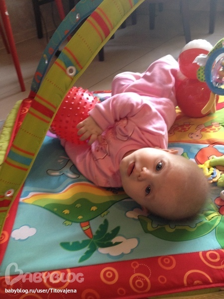 На коврике игрушки срываем, начинаем дуги гнуть, мобилька чиковская "летает" у нас по всей кровати, мы её "рвём" на части. Смешно)) Фитбол не любим, но терпим (не долго!)) )