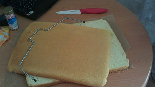коржи разрезать пополам, у меня спец.нож для коржей.