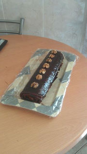 3 яйца, 1ст.л.сахара, 0,5 банки сгущенки, 100гр.маргарина или масла(растопить). 5ст.л.муки.1ч.л. рахрыхлителя. 0.5 банки вареной сгущенки. 1 плитка горького шоколада.