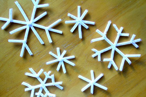 Делаем снежинку из синельной проволоки. Привязываем к ней ниточку, за которую мы ее будем опускать в соляной раствор.