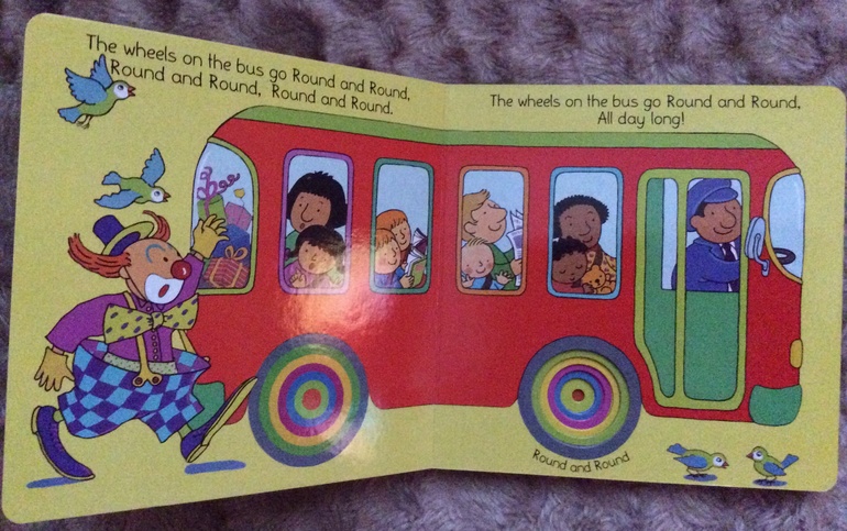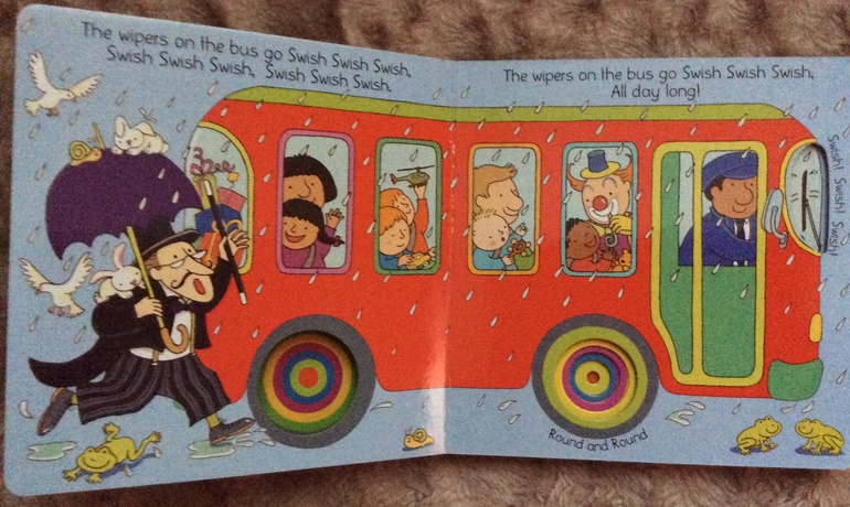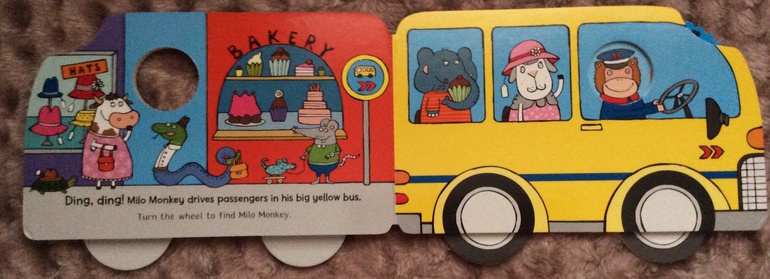 Книга-игрушка в виде автобуса с крутящимися колесами, с помощью встроенного колесика ребенок может менять мордочку водителя (разные животные).