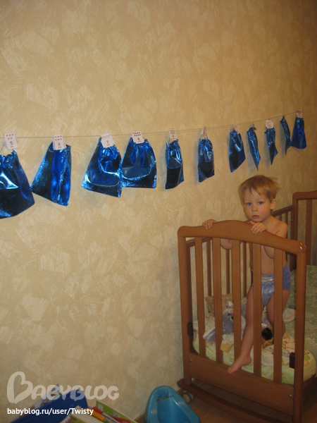 Папа наш повесил на выходных нам веревочку, а я ее дополнила нашими "адвент-мешочками" )))