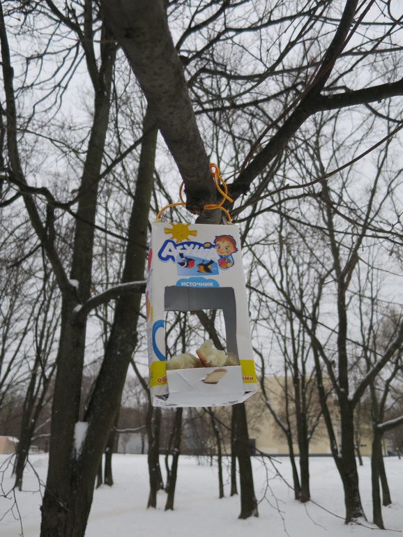 А еще вчера у нас было частью задания сделать кормушку для птиц. Делали, правда, тоже сегодня утром. Тема даже слегка украсить успел, пока мы одевались на прогулку. Заодно и ее повесили, пока нас ветром не снесло.