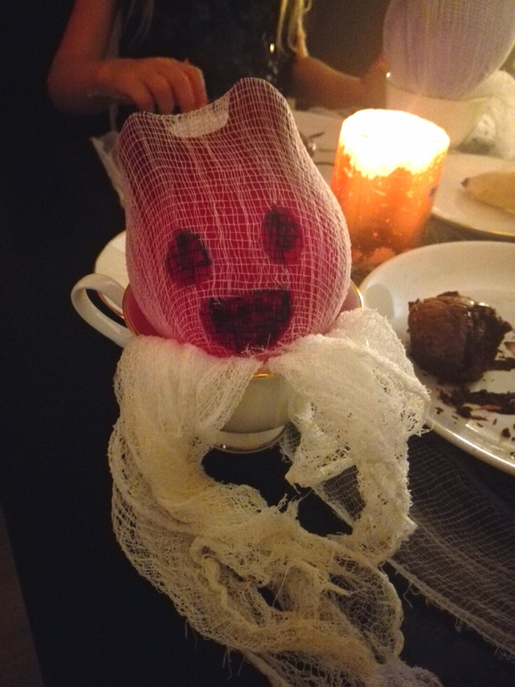 Сделал я пару приведений, просто надула маленькие воздушные шарики, одела марлю, завязала веревочкой, маркером нарисовала глаза и рот. Готово.