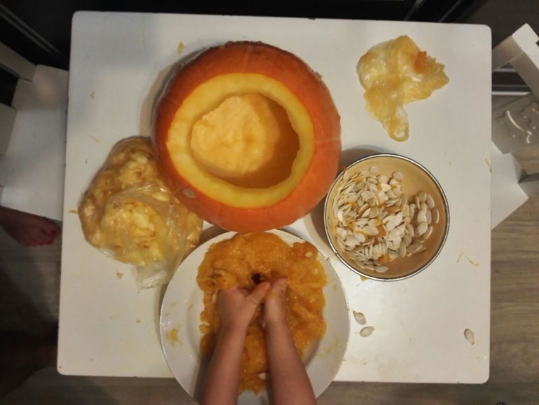 Приготовила 3 миски, нож и шило. Обязательно привлекайте к этому процессу детей! Берем тыкву, под углом вырезаем крышку( под углом, чтобы крышка потом не проваливалась) Вычищаем все внутренности. Мои девочки делали это с огромным удовольствием руками! Не удивительно, ведь все детки любят тактильные ощущения, размазывать кашу или творожок, а тут склизкая мякоть в которой еще и семечки! А запах!!! ммммм......Мяготь месилась, размазывалась, облизывалась, в общем все 33 удовольствия сразу