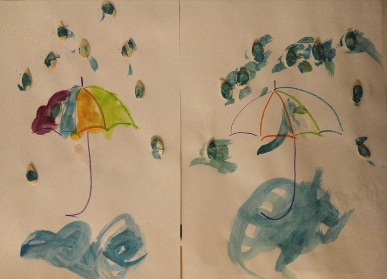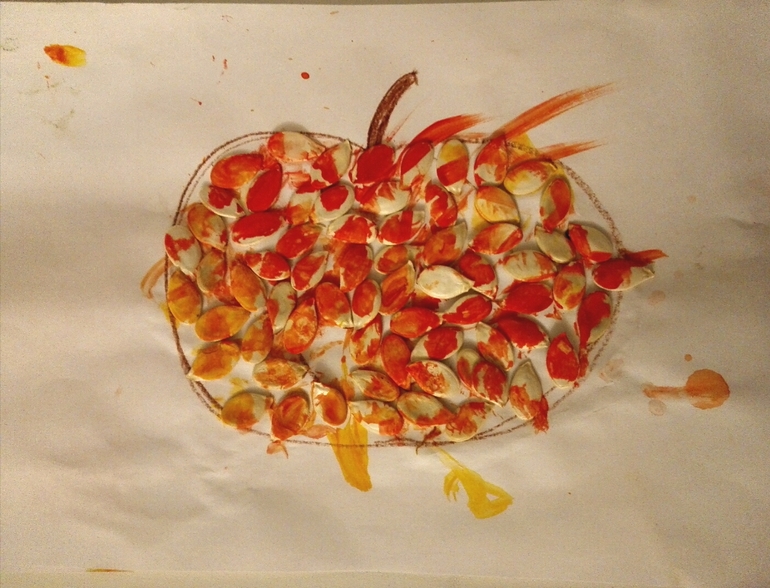 Потом крошки, приступили к сортировке, доставали косточки из мякоти и складывали в другую миску, отличное занятие для моторики! Косточки ,после , были разложены для сушки. Часть пойдет на еду, часть на поделки. А вот и они))) тема, осень, дождь и тыква!