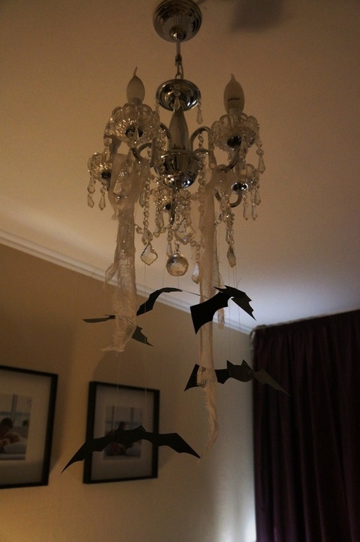 Распечатала с интернета шаблон летучих мышек, вырезала из черной бумаги, повесила на нитку на люстру и немного марли, тоже типа паутина.