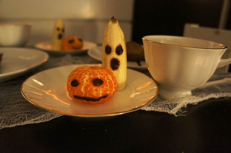 Так же я почистила банан, нарисовала той же массой глазки и ротик и получились приведения. Почищенные мандарины, так же украсила глазками и улыбочкой, получились маленькие тыквочки.