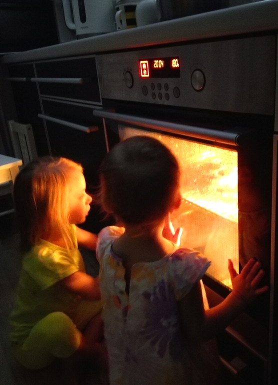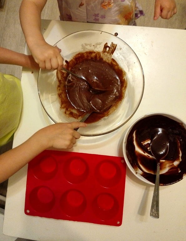 Далее мы выпекли шоколадные капкейки для паучков. Так же привлекайте детей! Это дает им неоценимый опыт! Т.к. я постоянно готовлю с детьми, у меня на кухне стоит старый детский столик и стульчики, т.к. удовольтсвие от готовки дети могут получить, если устойчиво стоят на полу, им удобно месить/мешать/солить и т.д. Если я делаю фарш, они из него лепят котлетки и обмакивают их в пекарских сухарях. Если мы делаем пирог, то они выкладывают картошку, грибы, мясо, солят, перчат, конечно паралельно все пробуют, сами бегают мыть ручки и берут тряпку для мытья того, что просыпали. Грязи конечно куча, но это прививает им самостоятельность и чувство значимости, полезности. Что-то я сильно отступила.....)))) Возвращаюсь к капкейкам)