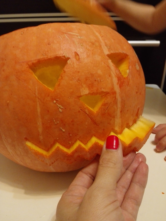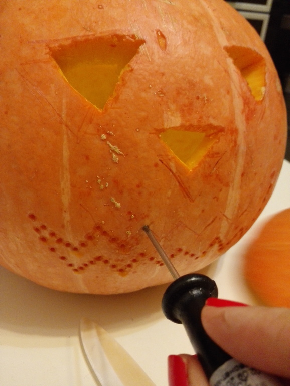 Далее я нарисовала на тыкве глаза, нос и рот. И проколола шилом по пириметру, сделала я это для того, чтобы случайно при вырезании не испортить. Потом просто прорезаю ножом. Тыква готова!