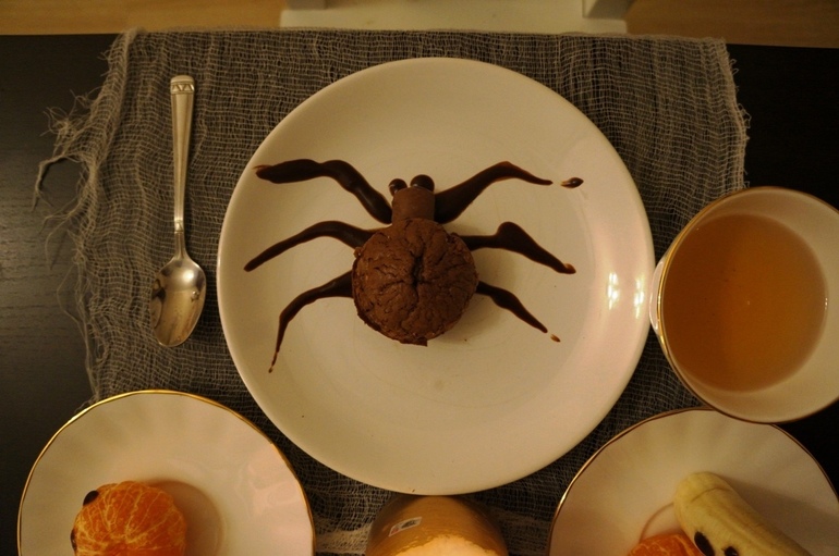Из остатков шоколадной массы делаем ножки паучку и глазки, я просто рисовала ложечкой, кексики выкладываем как брюшки паучков))).